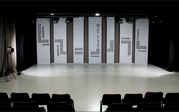 Oblikovanje in realizacija kulis oz. tekstilnih zaves za Srednjo dvorano Kosovelovega doma Sežana.