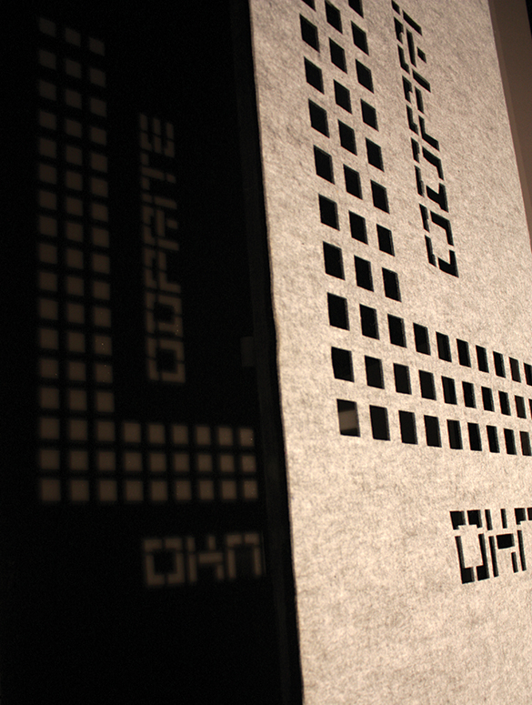 Delo je nastalo v sklopu magistrske naloge Tipografska tekstilna zavesa, ki je bila leta 2016 nagrajena s Fakultetno Prešernovo nagrado.